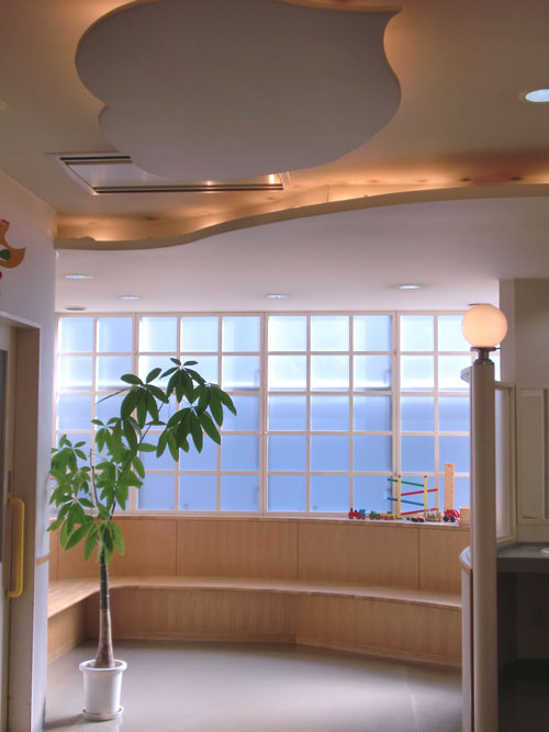 | <待合室> 大きな窓のある明るい待合室です。 ベンチや子供用の椅子、おもちゃなどはぬくもりのある木製です。 |